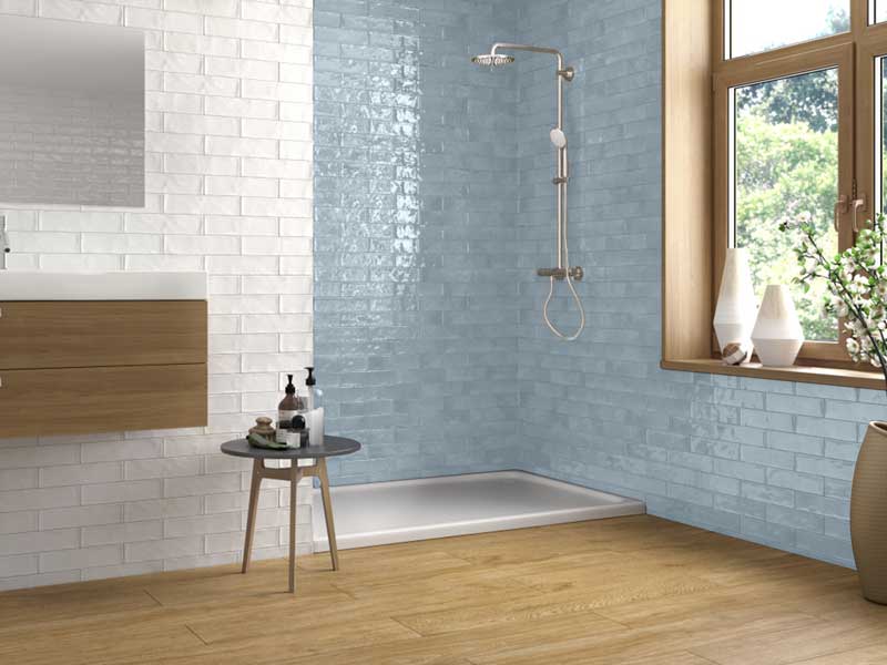 The Chloe Blue wall tiles offer a soft palette with variations in shading and a blend of blue hues. When the light hits the surface it really brings out the tonal beauty.