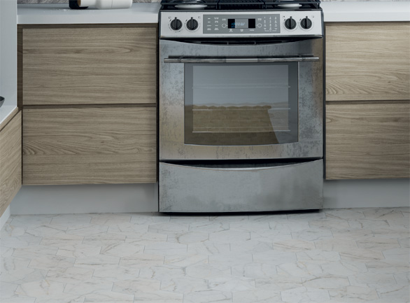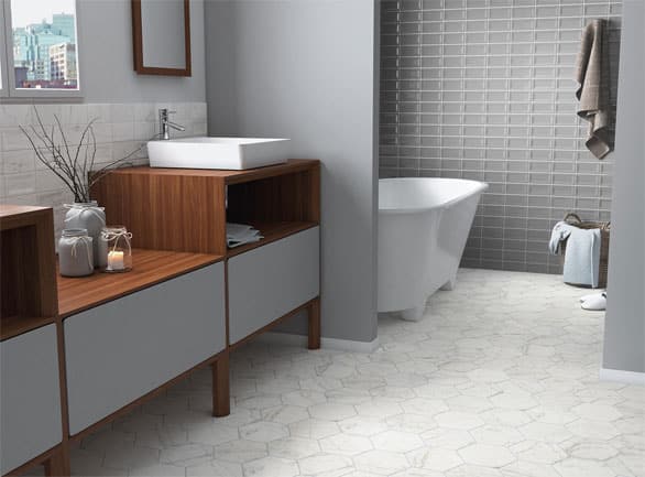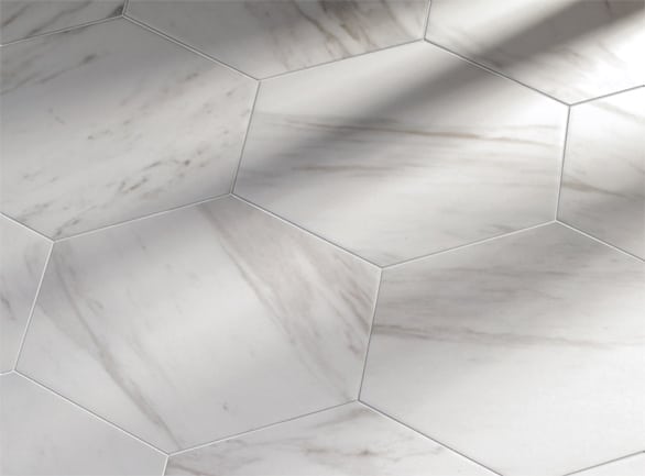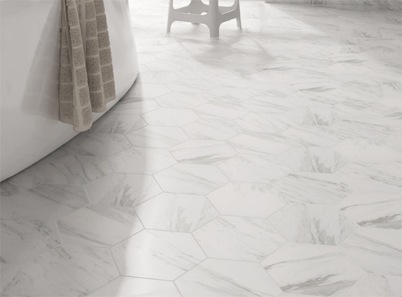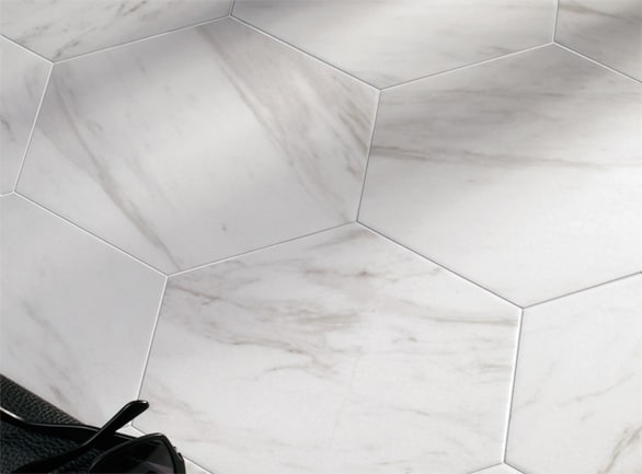 With the elegant Carrera Marble effect and quirky hexagon shape, coupled with the fact it can be used on the wall or floor, this is a very versatile range.