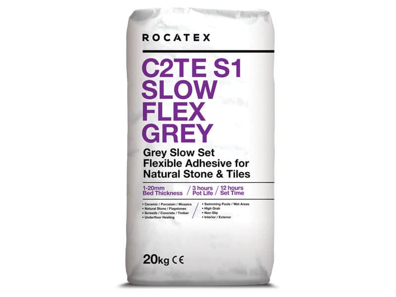 ROCATEX C2TE S1 Slow Flex White is a single part, flexible wall and floor tile adhesive. Perfect for fixing natural stone and tiles including ceramic, porcelain and mosaics. Why not use Rocatex Acrylic Primer on your substrate to ensure a strong bond.