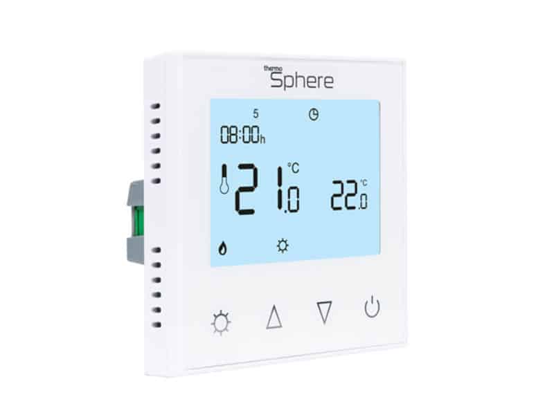 The ThermoSphere Programmable Thermostat allows for simple, programmable controls with electric underfloor heating. This allows for you to setup and adjust automatic heating schedules and make any adjustments to the advanced settings.