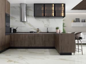 Marble remains central to this story. Calacata Gold, with its distinctive gold-effect veining, continues to be a popular choice. Looking into 2026, new formats will be introduced across some of our warmer and more strongly veined favourites, including Matterhorn. These marbles work beautifully as standalone statements or as part of patterned and mixed-material layouts.